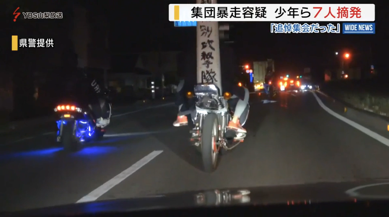 山梨県警の合同捜査班は甲斐市や南アルプス市で集団で暴走行為をしたとして、少年ら7人を摘発した。一部の容疑者は「仲間の追悼集会だった」などと供述しているという。