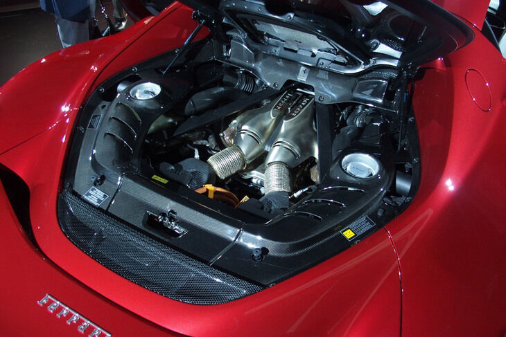 パワーユニットは市販フェラーリでは初となる120度のバンク角を採用するV6ターボ。これに電気モーターと外部充電が可能なリチウムイオンバッテリーを組み合わせている。ターボチャージャーはVバンク間に配置されており、このレイアウトもフェラーリ初だという。