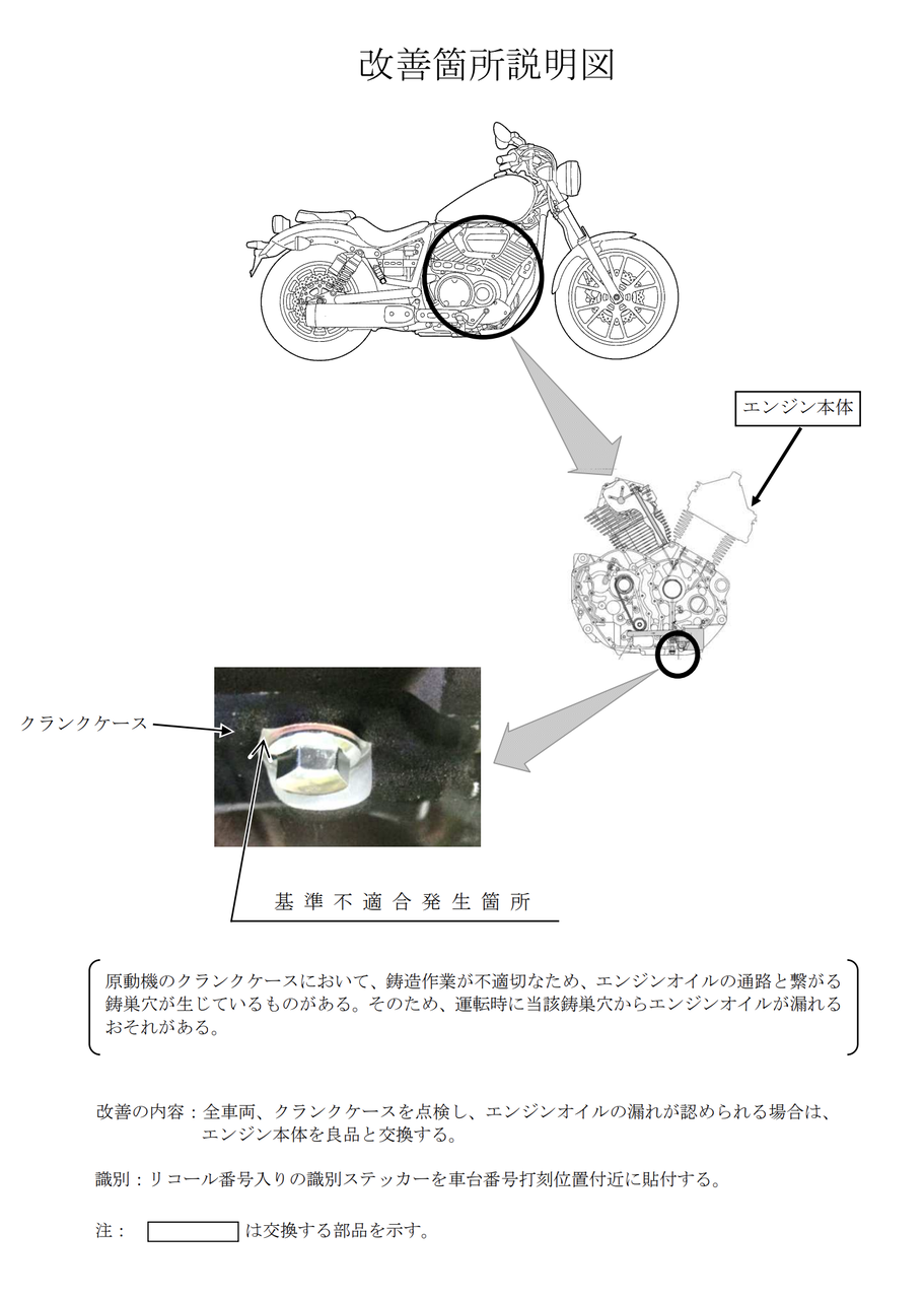 全車両、クランクケースを点検し、エンジンオイルの漏れが認められる場合は、エンジン本体を良品と交換する。