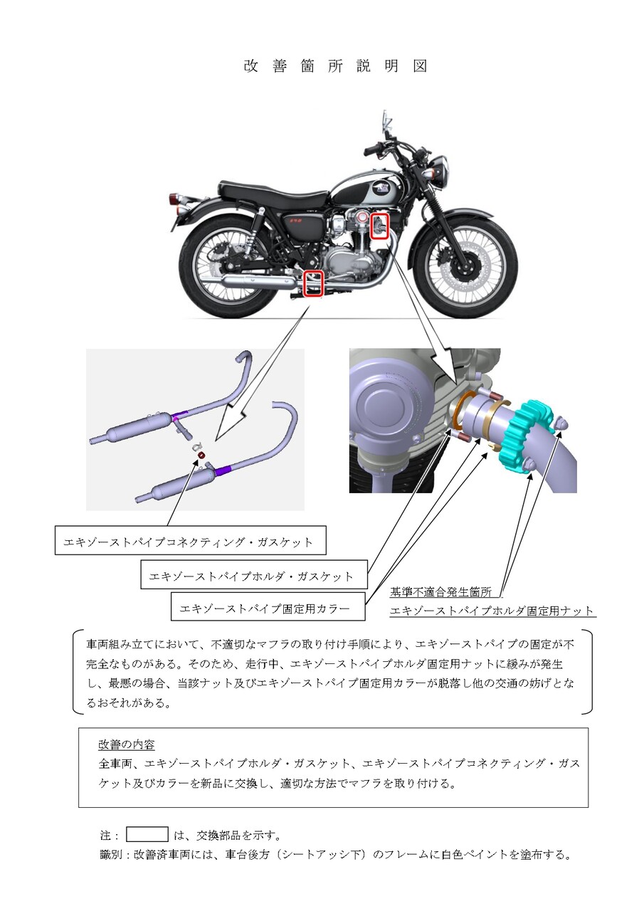 カワサキは「W800/STREET/CAFE」および「MEGURO K3」にエキゾーストパイプホルダ固定用ナット・カラーが脱落するおそれのある問題で国土交通省にリコールを届け出た。