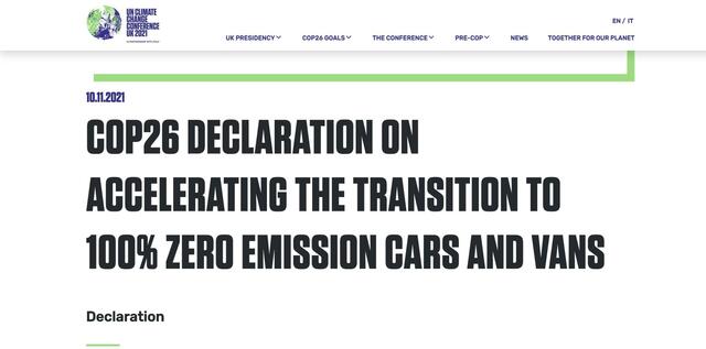 声明では、自動車(バンを含む)新車の販売を2035年までに主要市場で、2040年までに全世界で販売する全ての新車を、ゼロエミッション車(EVなど温室効果ガスを排出しない自動車)にすることを目指した。ただし、法的拘束力はない。