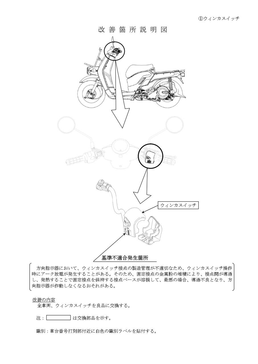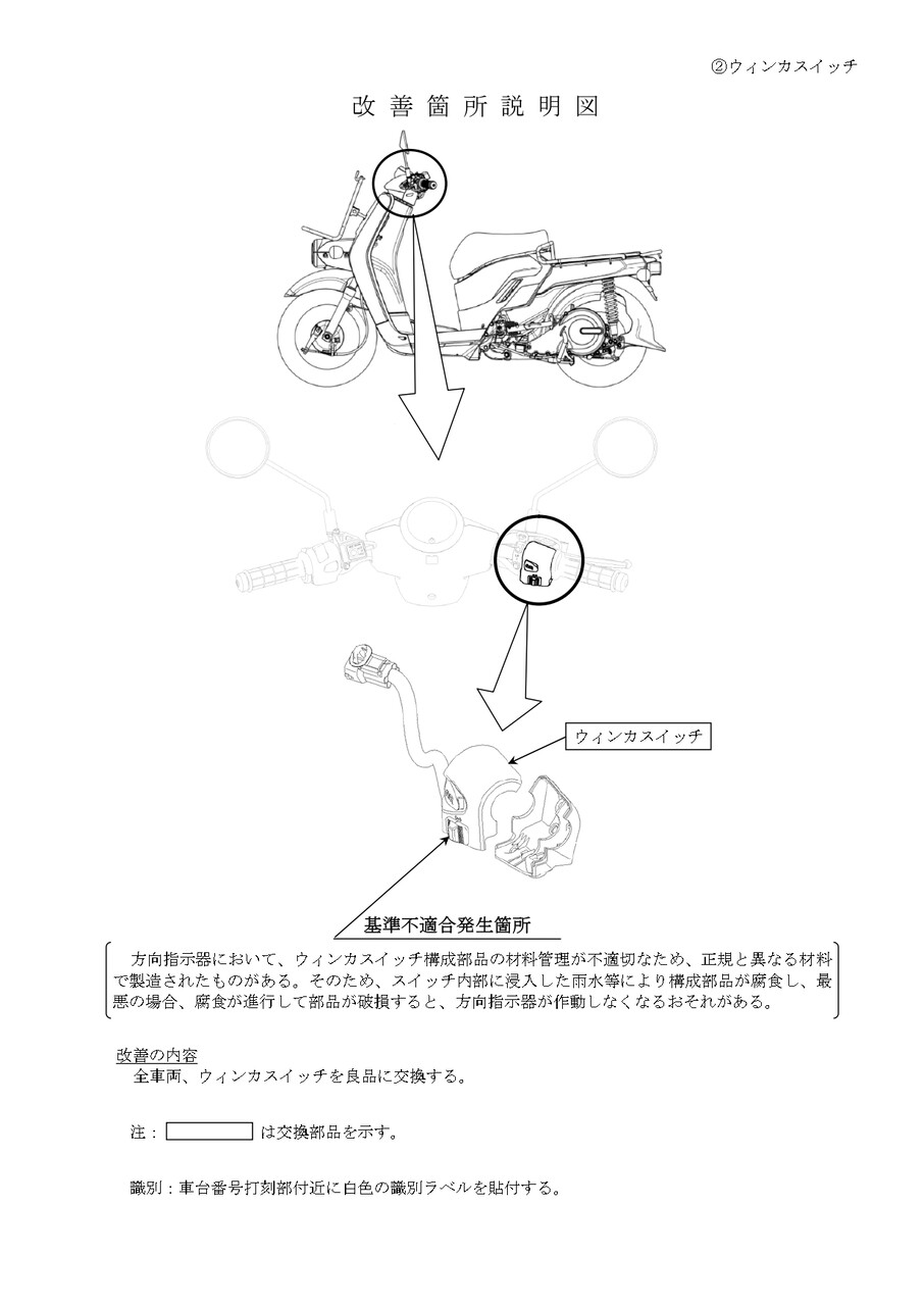 ②方向指示器において、ウィンカスイッチ構成部品の材料管理が不適切なため、正規と異なる材料で製造されたものがある。そのため、スイッチ内部に浸入した雨水等により構成部品が腐食し、最悪の場合、腐食が進行して部品が破損すると、方向指示器が作動しなくなるおそれがある。