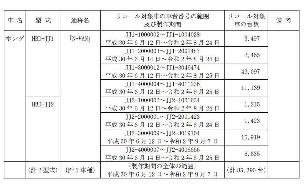 ホンダは12月2日、軽貨物車『N-VAN』のCVTに不具合があるとして、リコール(回収・無償修理)を国土交通省へ届け出た。対象となるのは2018年6月12日~2020年9月7日に製造された8万5390台。