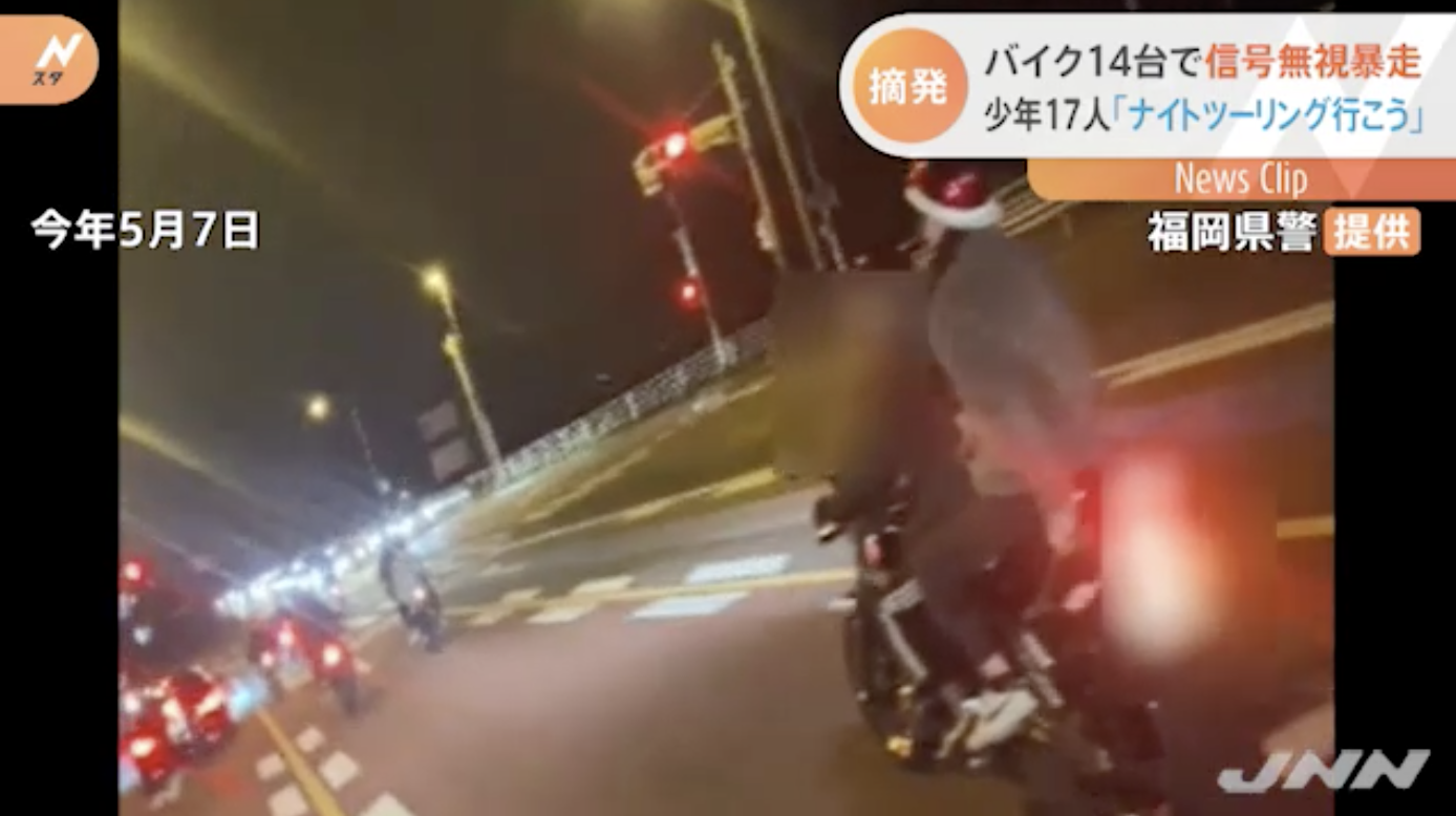 警察は、今年5月、宗像市と福津市の国道3号でバイク14台に乗って蛇行運転などを繰り返し、信号無視をしたとして、高校生13人を含む15歳から18歳までの少年17人を逮捕・書類送検しました。
