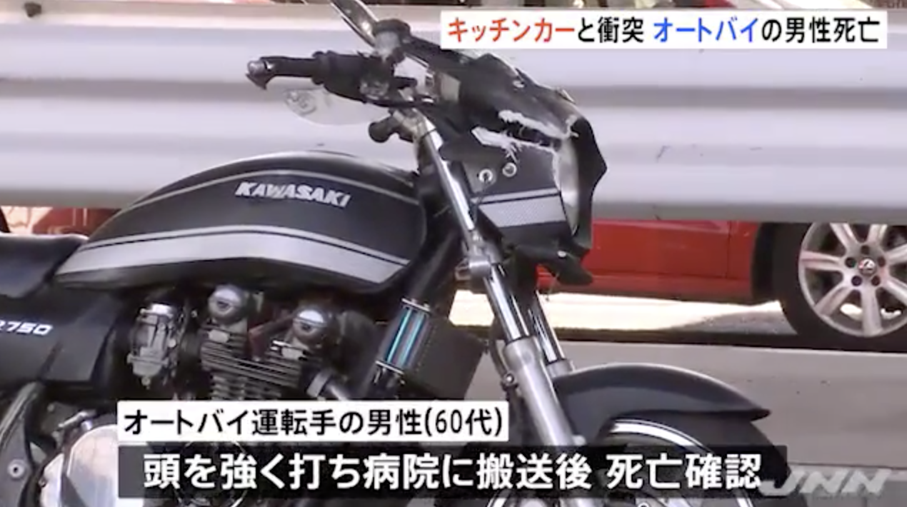 きょう午前9時すぎ、世田谷区新町の国道246号の路上で、オートバイとキッチンカーが衝突しました。この事故で、オートバイを運転していた60代の男性が頭を強く打ち、病院に運ばれましたが、その後、死亡が確認されました。