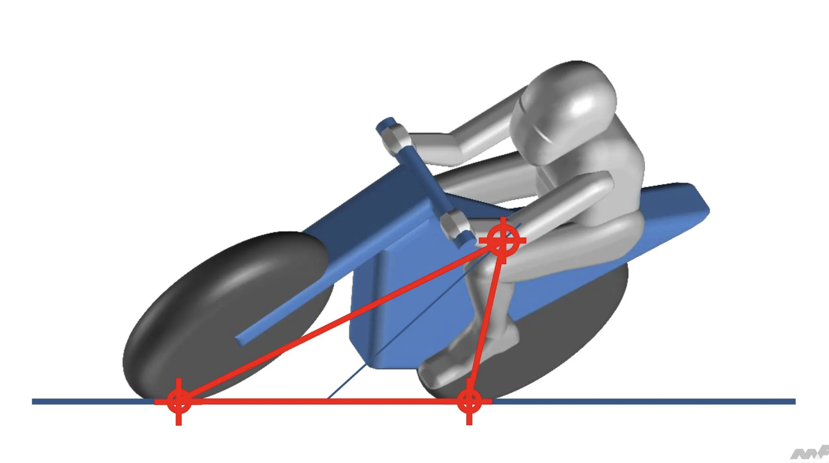 MCのコーナリングについて、日本では「体重移動説」(MCはライダーの体重移動で曲がる)という都市伝説が根強く語り継がれています。