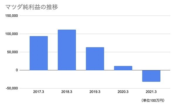 実のところ、コロナ禍でのマツダのビジネスは散々なものでした。2021年3月期の決算を見ると、グローバルの販売台数は前年比マイナス9%の128万7000台。当期純利益はマイナス317億円という大赤字です。20年の前半は、さらに悪く、最悪900億円の損失になるか? と思われるほど調子が悪く、300億円程度のマイナスで済んで、まだ良かったというほどです。
