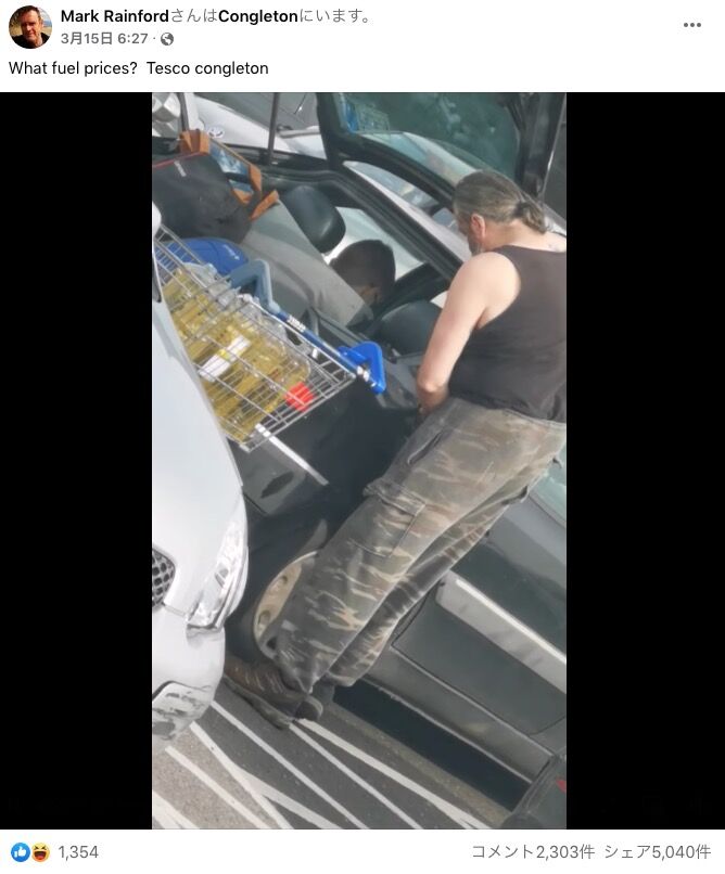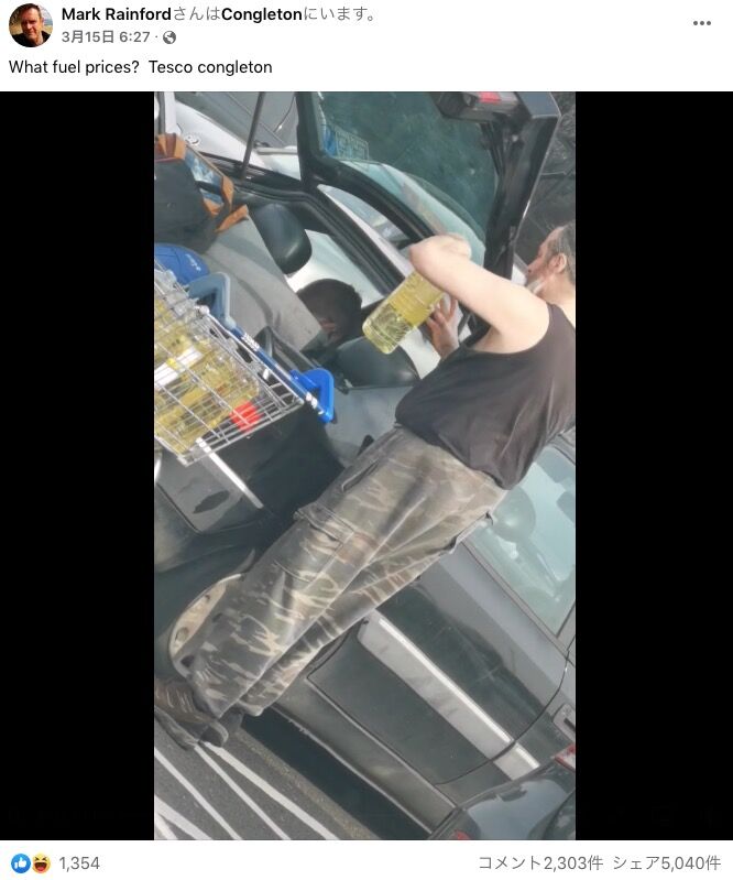 昨今の燃料価格高騰に伴い、ガソリン価格の値上がりに頭を痛めている人も多いことだろう。そんな中、イギリスの男性がガソリンの代わりに食用油を車の給油口に注いでいる姿が見られた。