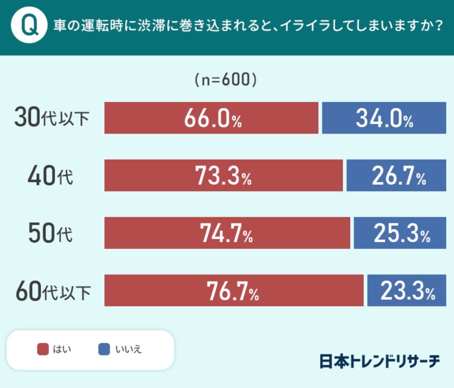 一方「いいえ」と答えたのは30代以下の34%が最も多く、年代が上がるほど渋滞時にイライラする人が多い傾向が見られた。