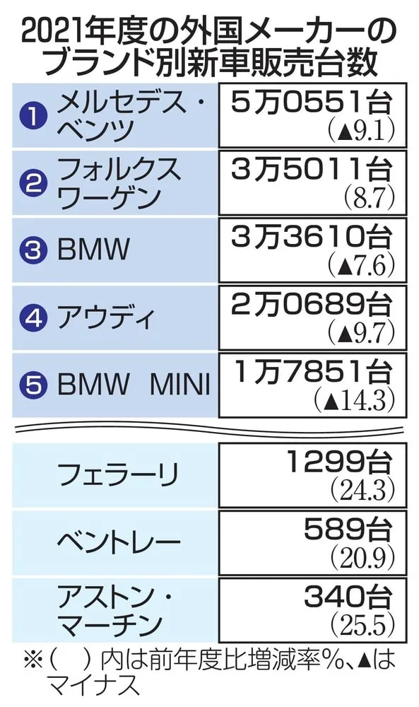 外国メーカーの新車販売全体は2.0%減の25万343台で、3年連続減少となった。輸入組合の担当者は「世界的な半導体不足による減産の影響が出た」と分析した。
