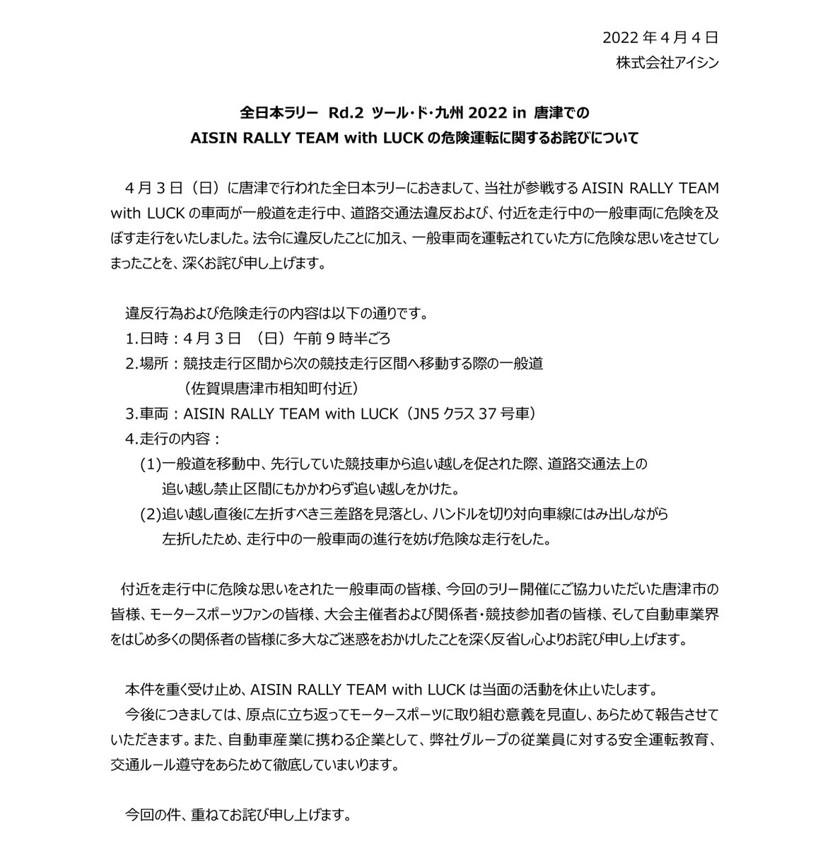 4/3に唐津で⾏われた全⽇本ラリーにおきまして、AISIN RALLY TEAM with LUCK の⾞両が⼀般道を⾛⾏中、道路交通法違反および付近を⾛⾏中の⼀般⾞両に危険を及ぼす⾛⾏をいたしました。法令に違反したことに加え⼀般⾞両を運転されていた⽅に危険な思いをさせてしまったことを深くお詫び申し上げます。