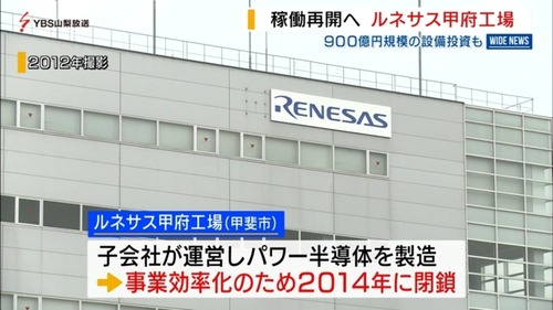 2022.05.17 20:15 YBS山梨放送2014年10月に甲府工場を閉鎖した半導体大手のルネサスエレクトロニクスが、再来年から甲府工場を再稼働させると発表した。