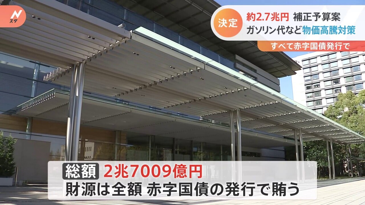 政府は17日、物価高騰対策の一環で編成する2022年度補正予算案の歳出総額を2兆7009億円とする方針を固めた。財源は全て赤字国債の発行による借金で賄う。同日閣議決定し、今国会での成立を目指す。
