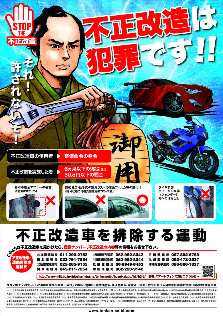 同省は、「不正改造車を排除する運動」として、関係省庁や関係団体と連携し、不正改造を「しない」、「させない」ための啓発活動をおこなっている。