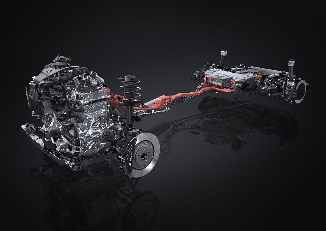 なかでも、最上級グレードの新型クラウンRSには、RX500hと基本システムを同じくする新開発の2.4Lターボハイブリッドの搭載が予想される。メインユニットの2.4Lターボエンジンは、T24A-FTS型をベースとしたもので、フロントモーターとDirect Shift-6ATが備わる。リアドライブは高出力/高トルクのモーターを内蔵するeAxleによって行われ、プロペラシャフトによるフロントエンジンからの動力伝達は行われない。レクサス RZで先行導入されたDIRECT4が採用され、4輪の駆動力と制動力が接地荷重に応じてコントロールされることでドライバーの意に沿った車両姿勢が実現される。