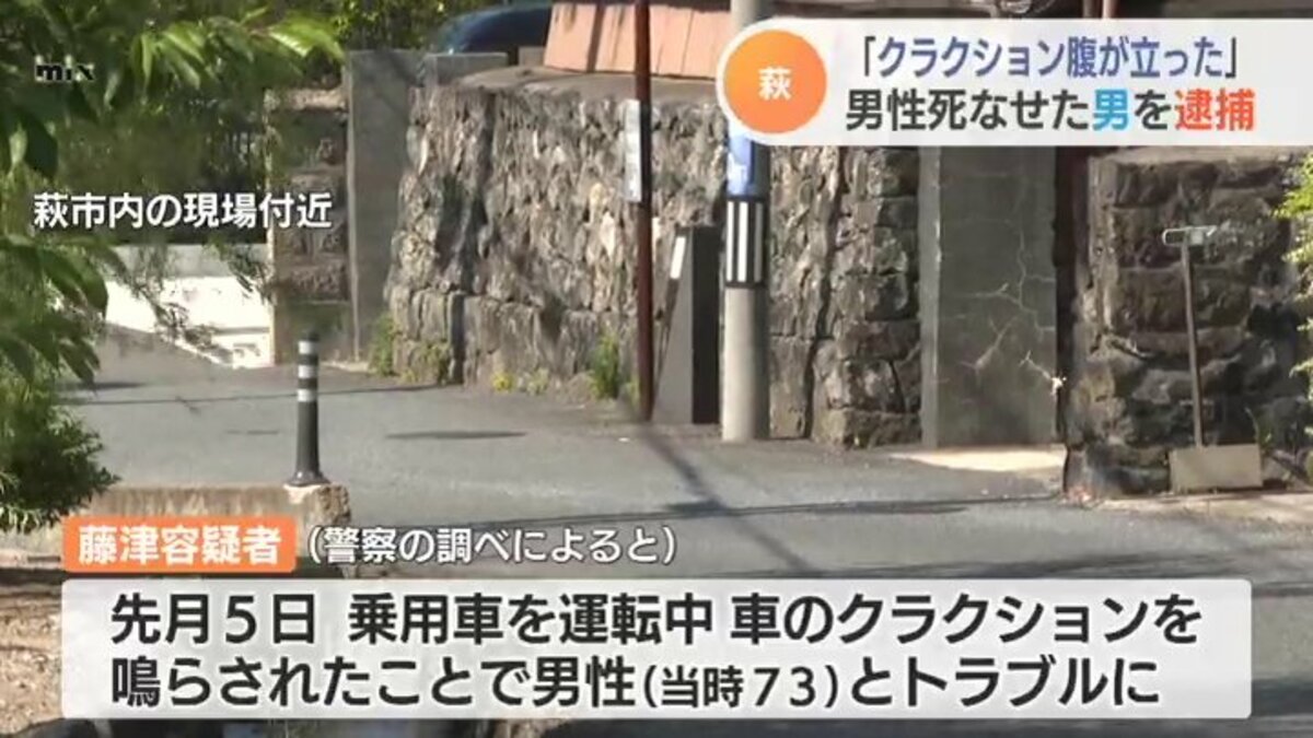 警察の調べでは、藤津容疑者は5月5日午後6時ごろ萩市内の路上で乗用車を運転していて車のクラクションを鳴らされたことから当時73歳の男性とトラブルになりました。