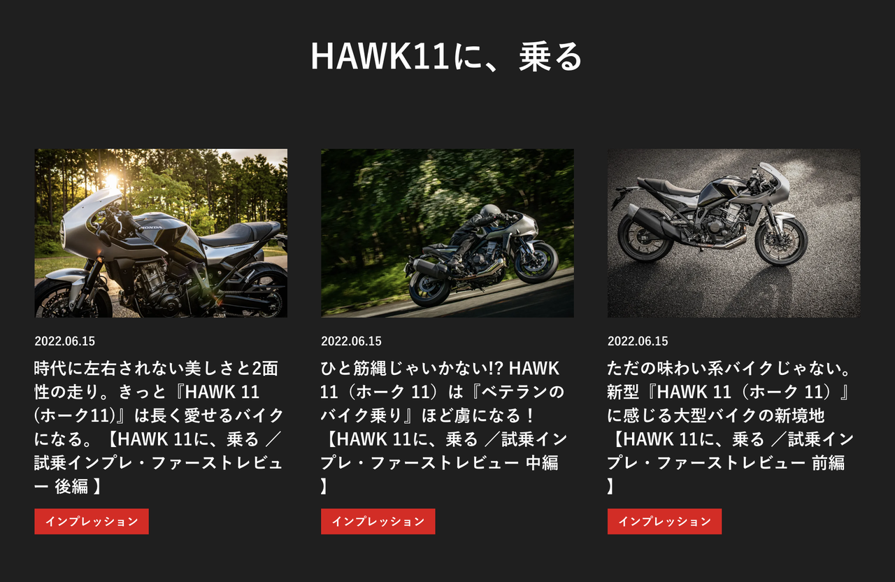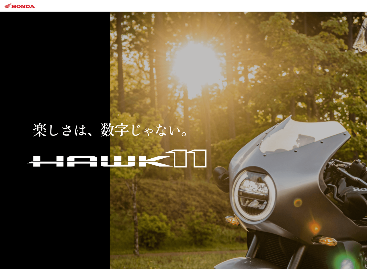 ホンダ、HAWK 11 (ホーク11) スペシャルサイトをオープン 2022/6/17 バイク速報 ホンダは、新型車「HAWK 11(ホーク11)」のスペシャルサイトを公開した。 スペシャルサイトでは、製品の仕様や特長、試乗インプレッションなど豊富なコンテンツを見ることができる。 Source: バイク速報