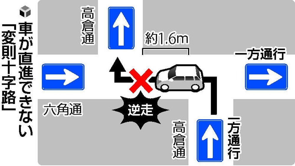 数メートルの逆走に目をつぶって直進してよいのか、回り道をしないと交通違反になるのか――。判断に迷ったドライバーから問い合わせが相次ぎ、京都府警は現地調査し、今後ルールを周知する。