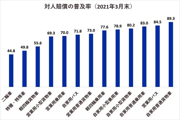 損害保険料率算出機構が2022年4月に発表した2021年度「自動車保険の概況」(概況)によると、10台に1台が未加入車という結果となった。対人、対物を合わせた普及率(自動車共済除く)を都道府県別に見ると大阪府が一番高く、次いで愛知県、神奈川県、京都府、千葉県と並ぶ。