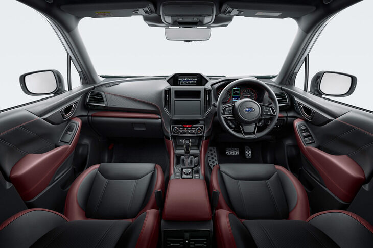 STIチューニングによる専用ダンパーを装備することで、重心の高いSUVでありながらスポーツセダンのようなハンドリングと上質な乗り心地を追求。またエクステリアでは艶のあるブラックパーツを採用して上質さとスポーティーさを、インテリアでは深みのあるボルドーのナッパレザーにより、上質な空間を演出しているという。(webCG)