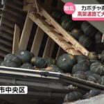 29日昼前、兵庫県神戸市の高架道路で大型トラックが横転し、積み荷のカボチャが高架下の道路に落下しました。 砕けて道路に散...